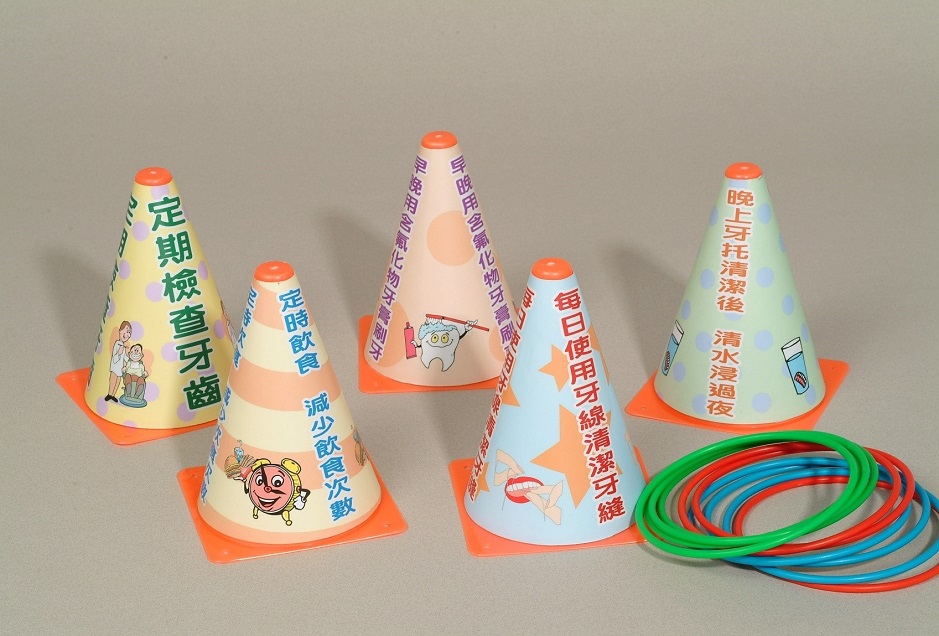 把籐圈拋到印有各種清潔牙齒方法的雪糕筒上