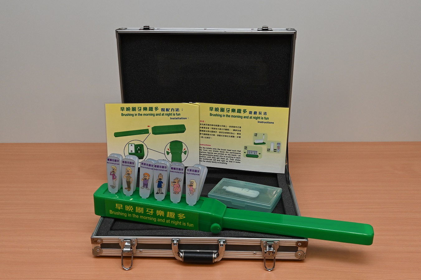 將牙刷的刷毛裝置在牙刷上,前排刷毛正面向著參加者(背面有卡通公仔圖案),讓參加者猜猜誰在那位置刷牙,直至全部猜完為止