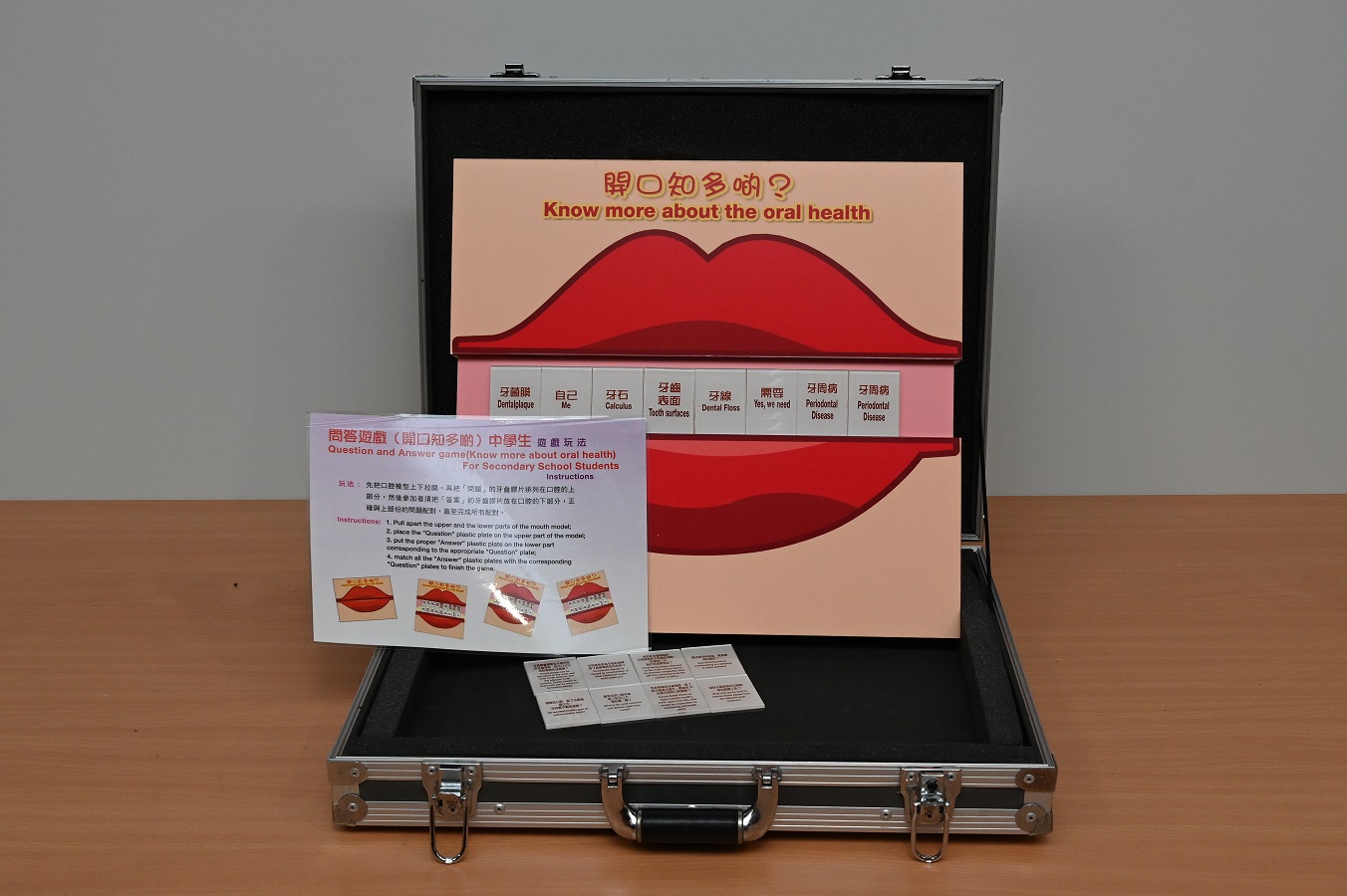 先把口腔模型上下拉開,再把「問題」的牙齒膠片排列在口腔的上部分,然後參加者須把「答案」的牙齒膠片放在口腔的下部分,正確地與上部分的問題配對,直至完成所有配對