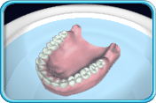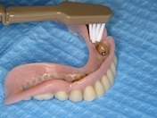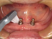 After removing the denture, use a single-tuft toothbrush to clean around the abutment of the implant. The cleaning method for the denture is the same as for conventional dentures. Use soft toothbrush and detergent to clean every part of the denture. Then rinse with water and immerse it in a glass of water overnight.