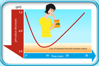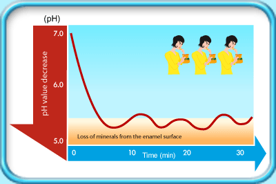 As soon as we eat or drink, the bacteria in the plaque will metabolise the sugar and produce acid. The acid will then lead to loss of minerals from the tooth surfaces. Chances of getting tooth decay will be reduced by allowing sufficient time in between meals for the saliva to neutralise the acid and redeposit minerals onto the tooth surfaces.