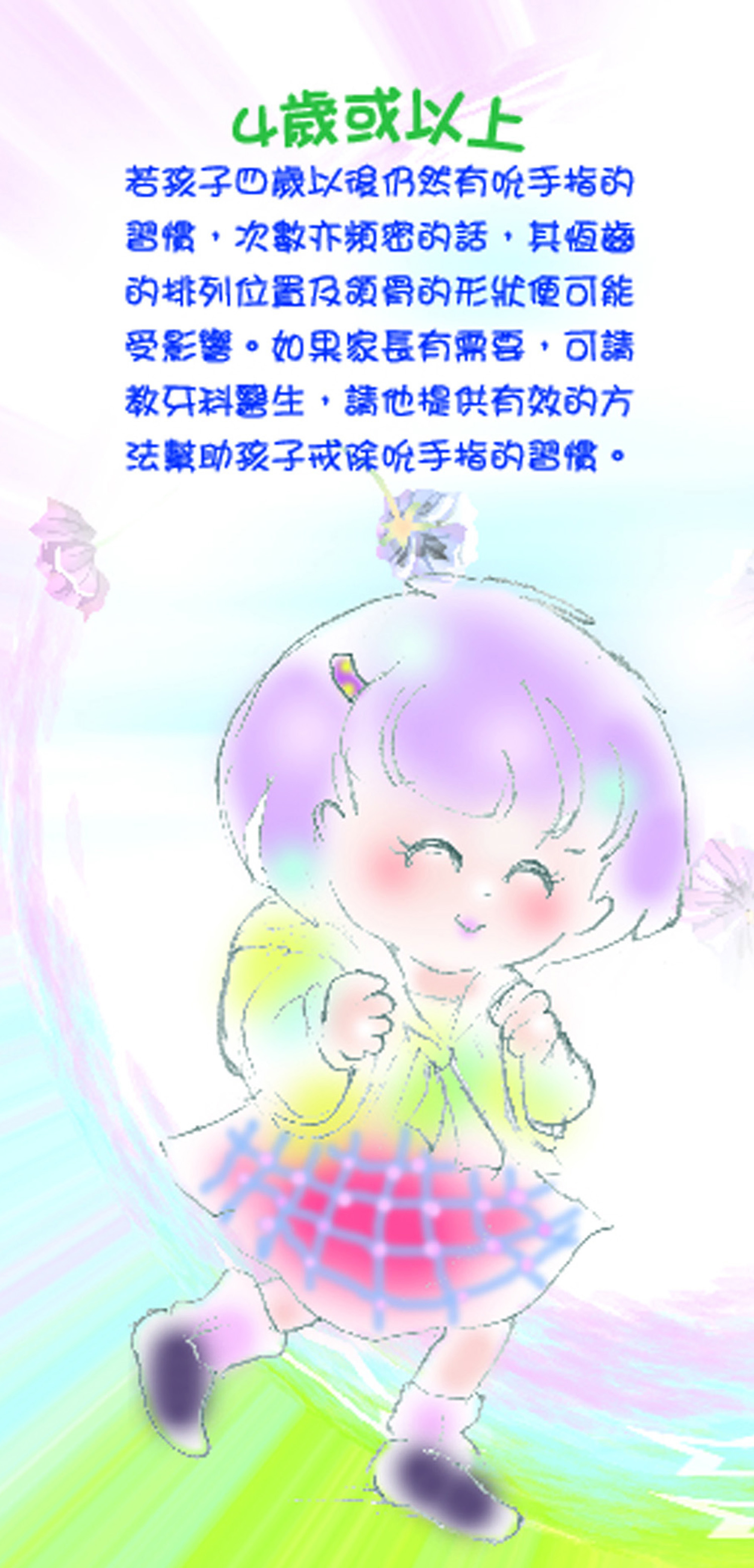 4歲或以上 若孩子四歲以後仍然有吮手指的習慣,次數亦頻密的話,其恆齒的排列位置及頜骨的形狀便可能受影響。如果家長有需要,可請教牙科醫生,請他提供有效的方法幫助孩子戒除吮手指的習慣。