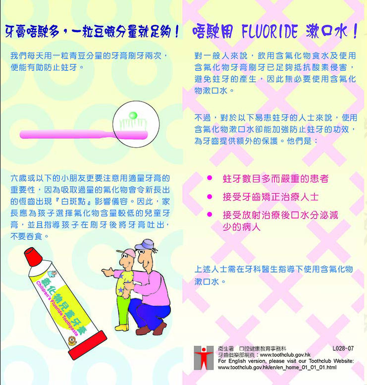 六歲或以下的小朋友更要注意用適量牙膏的重要性,因為吸取過量的氟化物會令新長出的恆齒出現『白斑點』影響儀容。因此,家長應為孩子選擇氟化物含量較低的兒童牙膏,並且指導孩子在刷牙後將牙膏吐出,不要吞食。