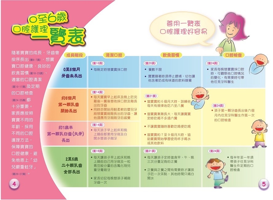 隨著寶寶的成長,牙齒會按序長出(第6-7頁),想寶寶口腔健康,良好的飲食習慣(第18-23頁)、適當的口腔清潔(第10-17頁)及定期的口腔檢查(第24-25頁)都十分重要。家長應按照寶寶不同的年齡,採用不同的口腔護理方法,保障寶寶的口腔健康,避免他患上「幼兒嚴重蛀牙」(第26-27頁)。