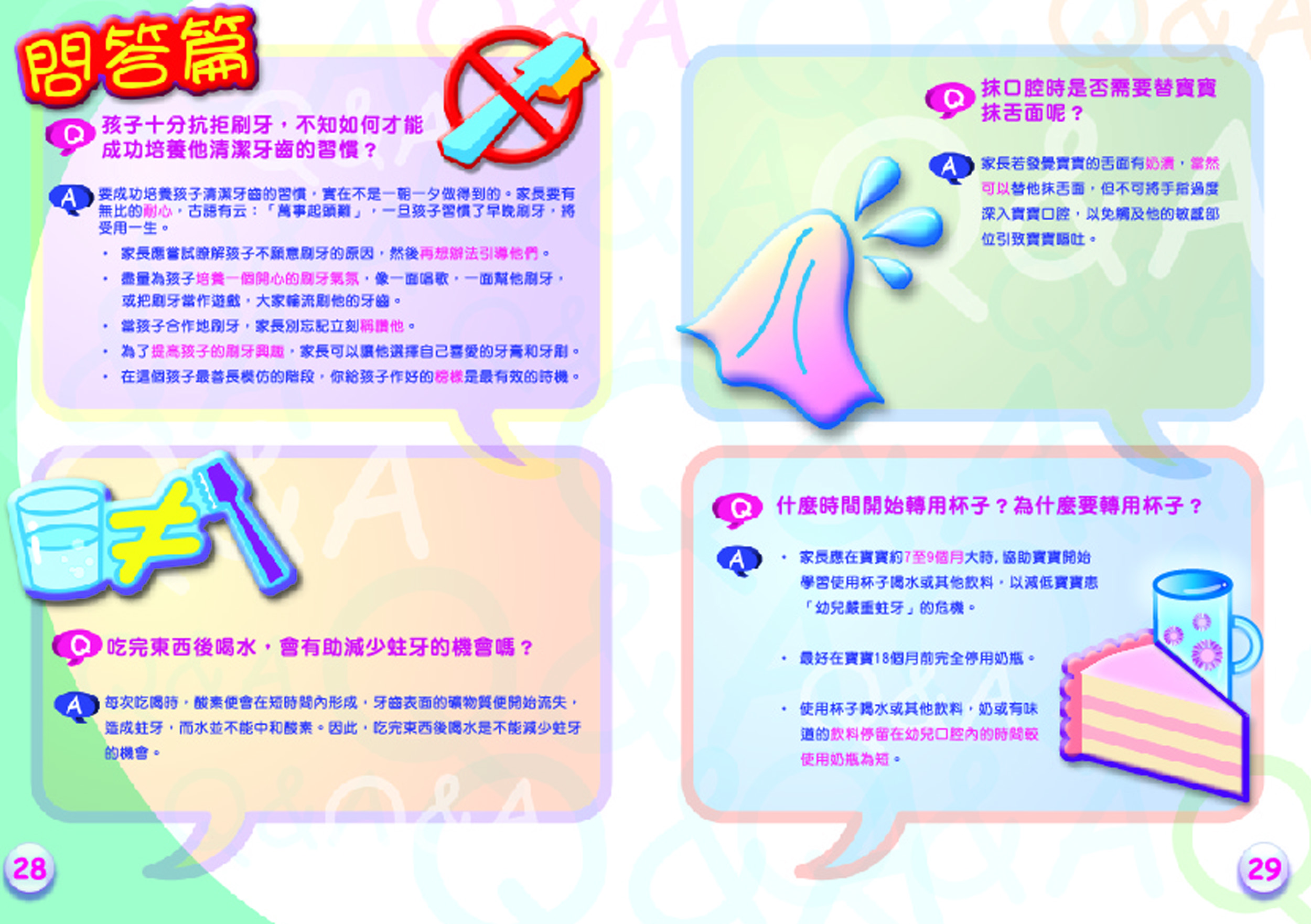盡量為孩子培養一個開心的刷牙氣氛,像一面唱歌,一面幫他刷牙,或把刷牙當作遊戲,大家輪流刷他的牙齒。