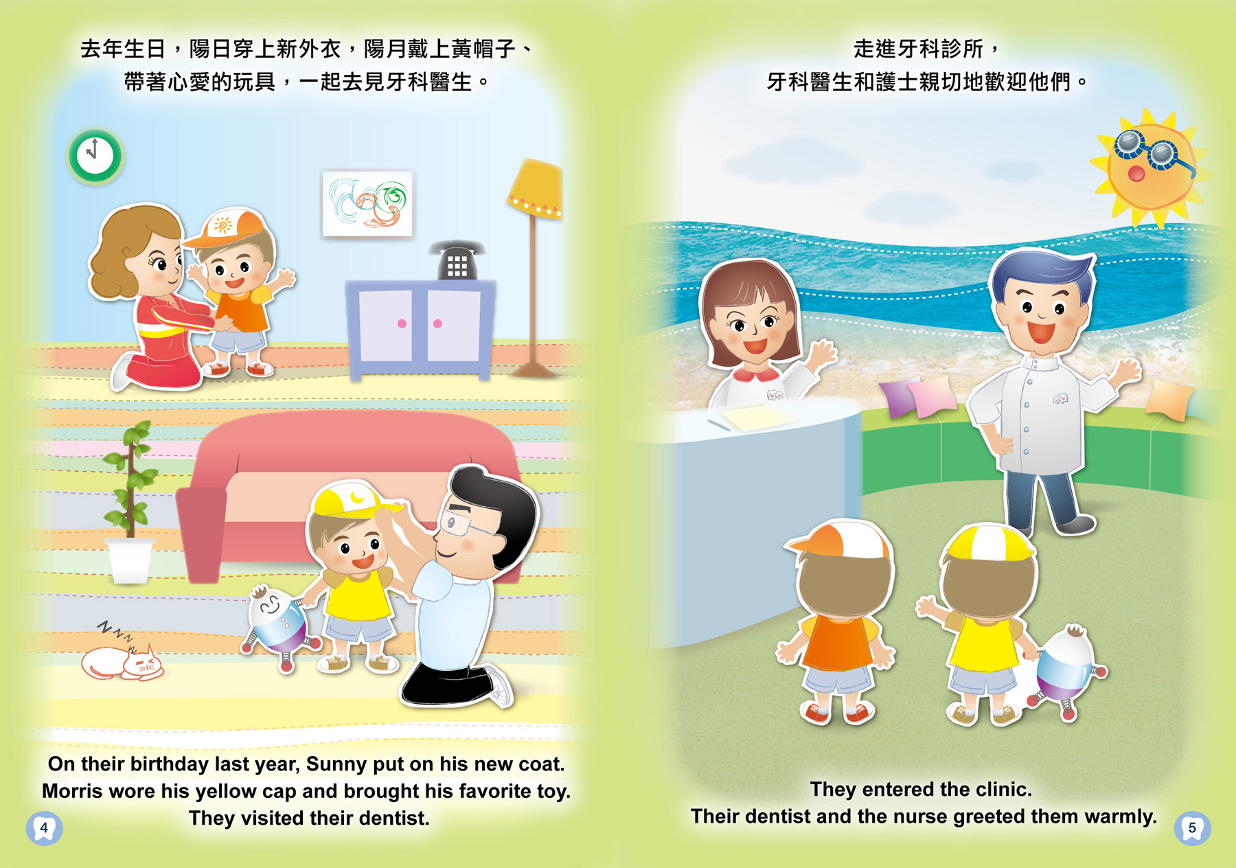 去年生日,陽日穿上新外衣,陽月戴上黃帽子、帶著心愛的玩具,一起去見牙科醫生。