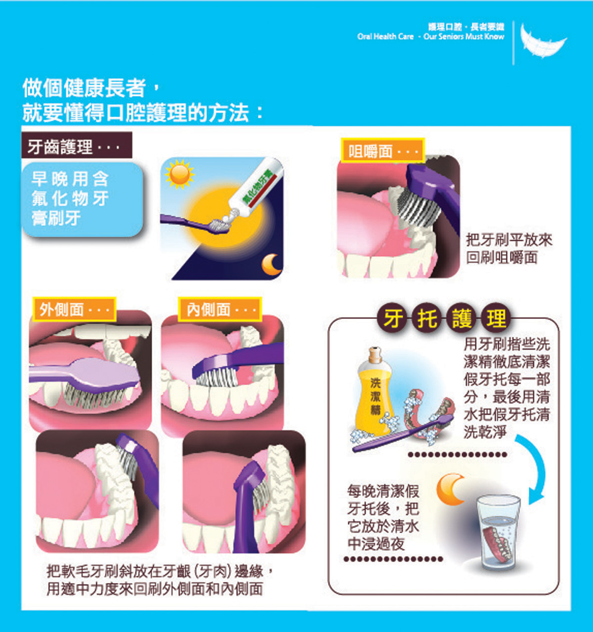 做個健康長者, 就要懂得口腔護理的方法: 牙齒護理... 早晚用含氟化物牙膏刷牙 外側面... 內側面... 把軟毛牙刷斜放在牙齦(牙肉)邊緣,用適中力度來回刷外側面和內側面 咀嚼面... 把牙刷平放來回刷咀嚼面 牙托護理 用牙刷揩些洗潔精徹底清潔假牙托每一部分,最後用清水把假牙托清洗乾淨 每晚清潔假牙托後,把它放於清水中浸過夜