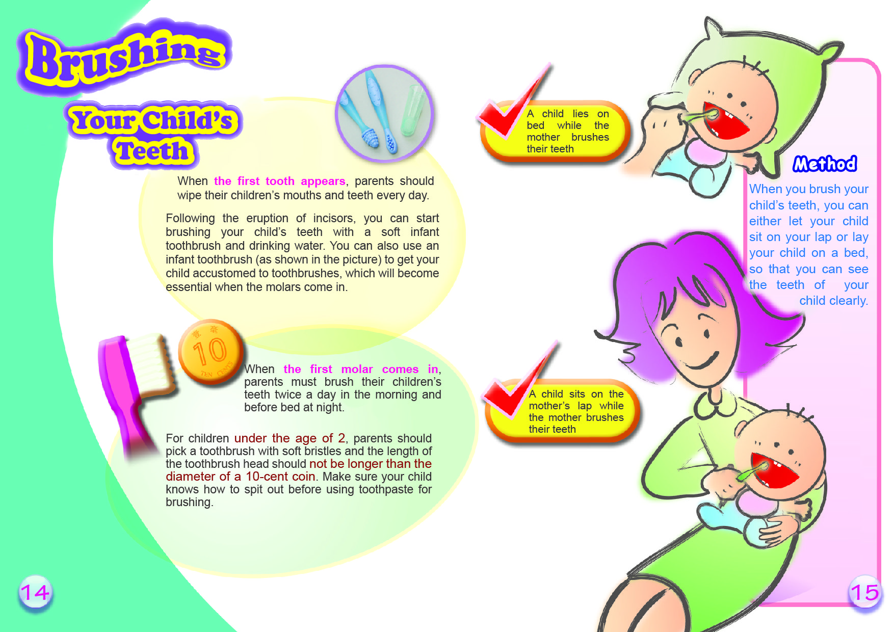 When you brush your child's teeth, you can either let your child sit on your lap or lay your child on a bed, so that you can see the teeth of your child clearly.
